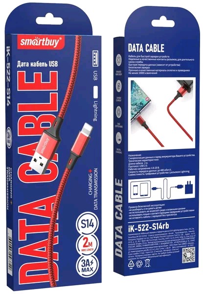 Дата-кабель Smartbuy S14 Lightning красн. черный 3А, 2м (IK-522-S14rb)