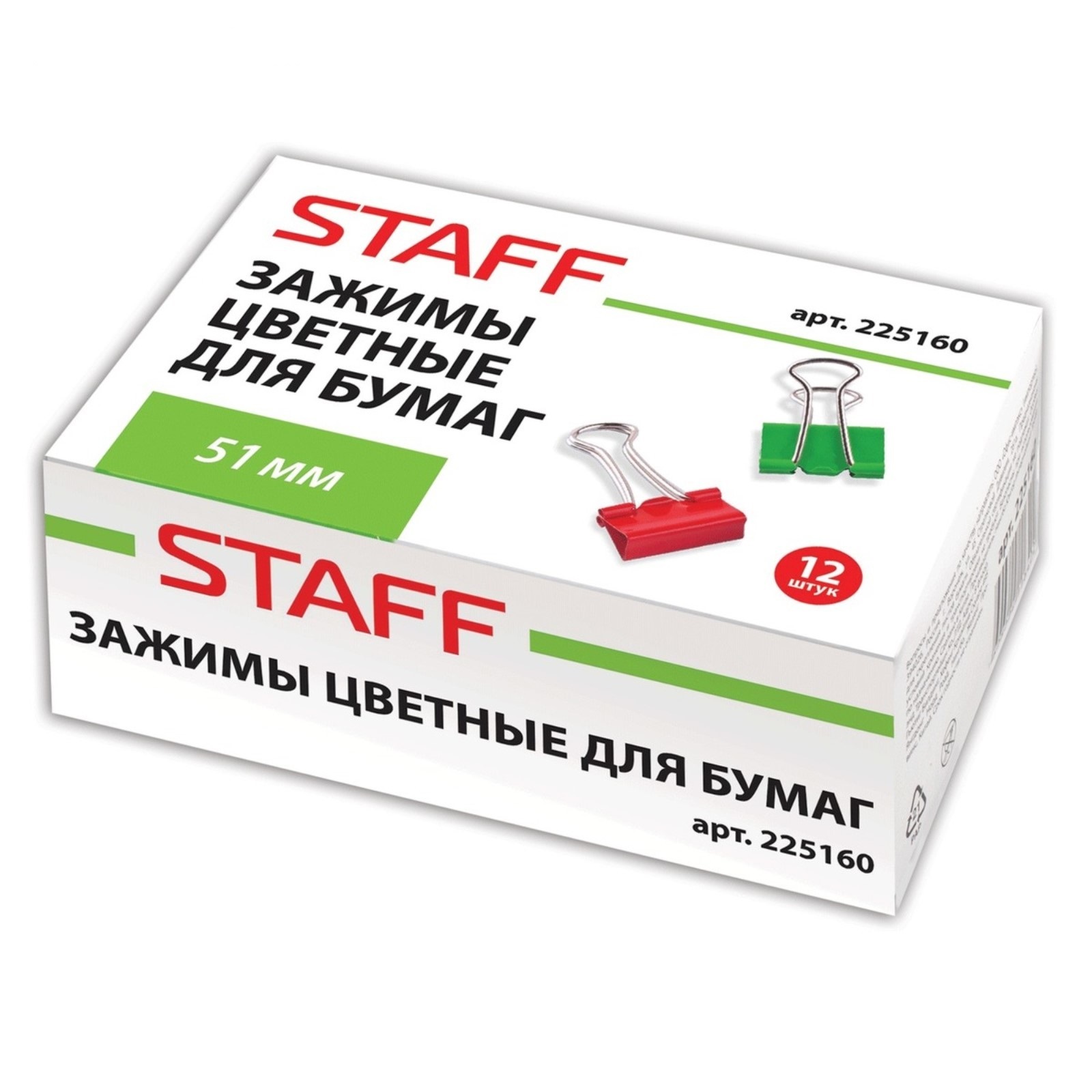 Зажимы для бумаг STAFF, компл 12шт., 51мм, на 230л., цветные, в карт.коробке,